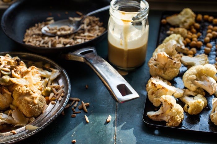 Chop cauliflower into florets and place in a large bowl with chickpeas.